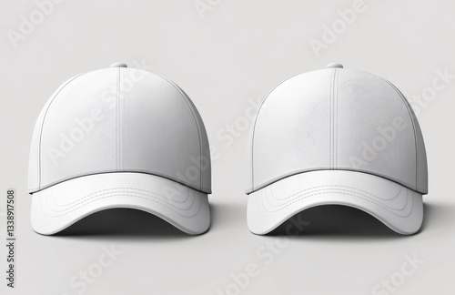 This mockup presents a white baseball cap, with views of both the front and back, against a grey background