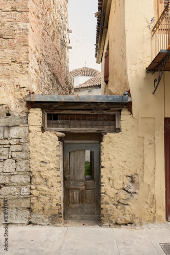 This quaint stone house in Nafplio features a weathered wooden door, inviting exploration while blending seamlessly with its historical surroundings and vibrant atmosphere.