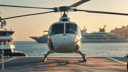 This Rotorcraft is stationed on a private dock, surrounded by luxury yachts during a beautiful sunset.