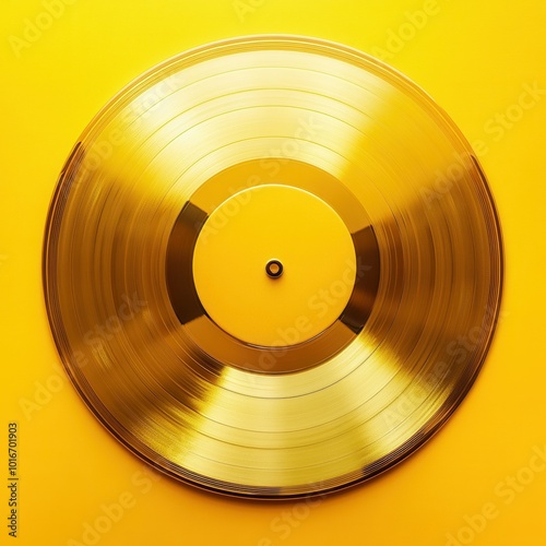 This striking golden vinyl record is centered against a bright yellow backdrop, highlighting the beauty of music memorabilia. The shiny surface reflects light, emphasizing its uniqueness and capturing