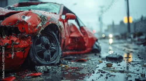 This striking image captures a damaged red car surrounded by rain-soaked streets, evoking feelings of neglect and urban decay in a moody atmosphere.