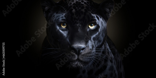 This striking image showcases a Panther in a front view against a black backdrop. Copy Space