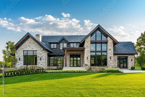 modern, home, residence, architecture, lawn, landscaping, tree, blue, sky, afternoon, light, glasses, window, stone, design, wood, accent, contemporary, style, space, neighbourhood, exterior, view, front, yard, sunlight, luxury, element, high-coloured, colours, peaceful, setting, building, feature, green, grass, natural, surrounding, family, picturesque, scene, inviting, atmosphere, roomy, layout, elegance, comfortable, living