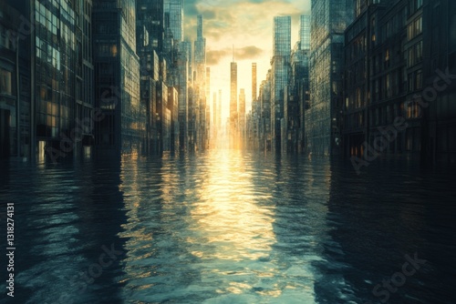 This stunning image captures a surreal urban landscape with skyscrapers reflecting in calm water under a glowing sunset. A mesmerizing visual journey.