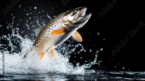 This stunning image captures a trout leaping out of the water, surrounded by splashes and droplets, symbolizing vitality and the beauty of nature’s aquatic life.