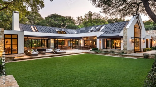modern, farmhouse, architectural, design, open, layout, large, window, covered, veranda, dusk, lighting, white, cladding, dark, roof, green, lawn, front, yard, contemporary, style, natural, light, kitchen, dining, area, living, room, elegance, cosy, atmosphere, home, exterior, minimalist, architecture, residential, landscaping, warm, tone, inviting, space, rural, charme, luxury