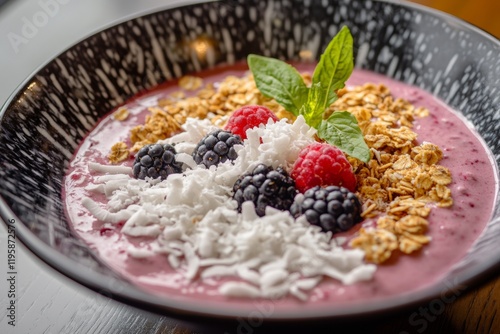 This vibrant smoothie bowl features a smooth, berry-infused base, topped with blackberries, raspberries, crunchy granola, and shredded coconut, ideal for a healthy breakfast