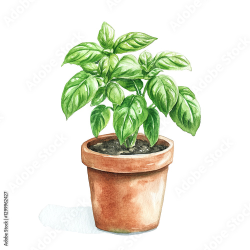 This watercolor depicts a detailed illustration of a potted basil plant with lush green leaves and a pot.