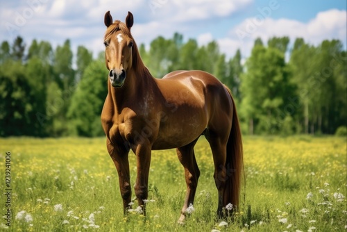 Thoroughbred Horse Grazing in Beautiful Green Pasture of Equine Industry Farm