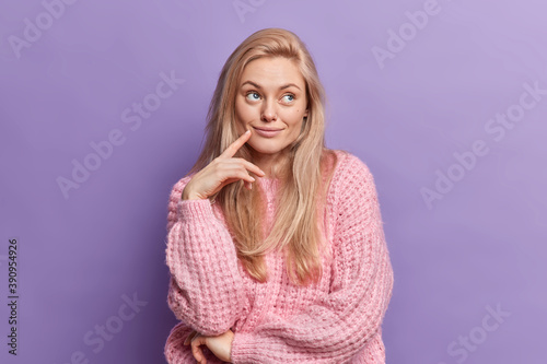 Thoughtful blonde young European woman has pensive expression keeps finger on face dressed in knitted jumper concentrated aside isolated over purple background. Pensive millennial female indoor.