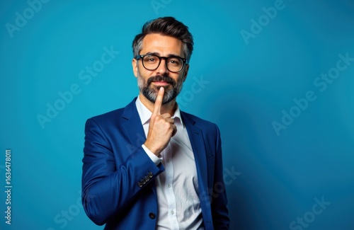 man, male, professional, business, suit, goggles, beard, thoughtful, serious, gesture, silence, secret, confident, formal, portrait, indoor, blue, background, stylish, modern, executive, thinking, communication, expression, pose, confidence, leadership, smart