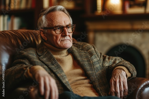 Thoughtful elderly gentleman in glasses sits in a leather chair, lost in contemplation.
