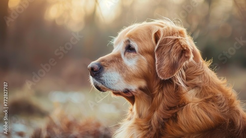 golden retriever, dog, outdoors, spring, nature, animal portrait, pet, calm, loyal, serene, contemplative, canino, peaceful, tranquil, gentle, companion, friendly, furry, relaxation, grass, warm light, purebred, thoughtful, obedience, fluffy, pastoral, looking away, faithful, leisure, country, harmony, animal welfare, sunshine, golden hour, generative, ai