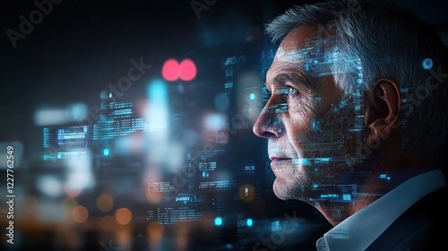 man, digital, technology, datum, projection, thoughtful, night, profile, modern, futuristic, analysis, innovation, vision, business, concept, interface, information, science, research, computing, intelligence, visualisation, graphic, design, portrait, communication, insight, trend, urban, lifestyle, age, life events, strategy, progress, creativity, exploration, perspective, connection, understanding, human, evolution, cyber, development, idea, impact, future