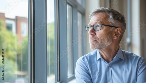 adult, window, portrait, people, indoor, man, horizontal, business, confidence, office, happiness, contemplation, technology, vertical, cheerful, communication, half face, connection, facial expression, content, modern, eyewear, eyeglass, looking, expertise, satisfaction, unshaved, convenience, relaxation, head shot, goggles, thoughtful, middle-aged, grey hair, blue shirt, indoor, calm, greenery, looking out, serious, natural light