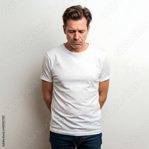 Thoughtful Man in White T-shirt Looking Down with Hands Behind Back