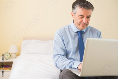 50s, mature adult, man, male, caucasian, indoor, businessman, brown eyes, dark eyes, grey hair, short hair, attaching, shirt, bedchamber, bed, morning, home, house, household, homelike, apartment, domicile, abode, lifestyle, sitting, using, typing, laptop, notebook, technology, computer, wireless, happy, smiling, cheerful, working