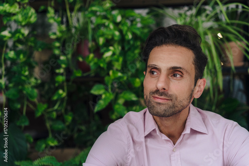 thoughtful, mature, businessman, green, plant, smiling, sustainability, 1, people, adult, business, man, casual attire, occupation, job, potted plants, pensive, contemplation, stubble field, beard, brown hair, caucasian, looking, office, colours, male