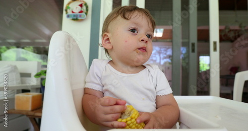 Thoughtful pensive baby infant on highchair holding healthy corn snack