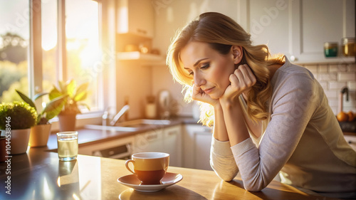 Thoughtful woman gazing at coffee cup in kitchen bathed in morning light.