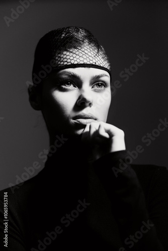 Thoughtful woman in a dark outfit, with a fishnet headpiece, expressing contemplation and confidence. Elegant and minimalistic black and white portrait.