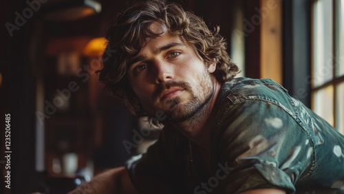 young men, curly hair, portrait, casual attire, window, soft focus, natural light, photogenic, green shirt, studio photography, closeup, masculine, face, gaze, candid, lifestyle, depth of field, photo, modern, artistic, mood
