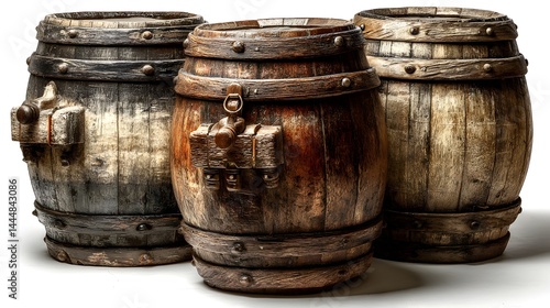 Three aged wooden barrels with metal bands and aged textures stand on a white background showcasing rustic charm and vintage appeal.