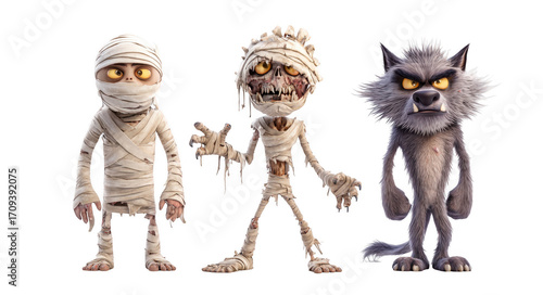 Three animated characters featuring mummy, zombie, and wolf. mummy is wrapped bandages, zombie has decayed appearance, and wolf has fierce expression. These characters evoke playful yet spooky