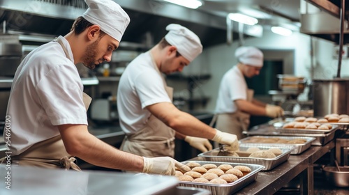 Three bakers skillfully shape and arrange dough in trays, focusing on their tasks in a bustling kitchen filled with equipment. The atmosphere is energetic and industrious