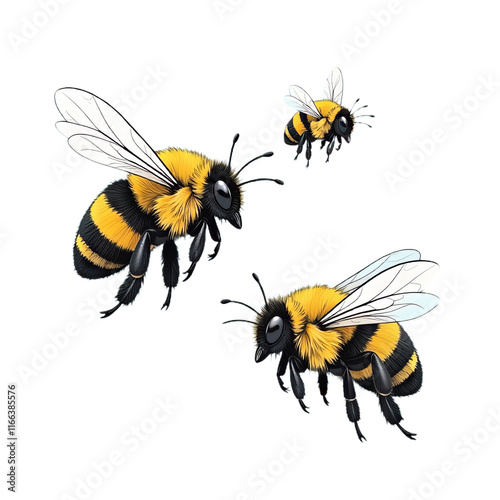 Three bees in flight, showing their fuzzy yellow and black bodies and wings against a clear blue sky