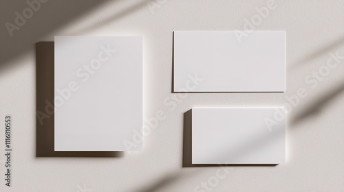 Three blank cards in varying sizes are displayed on a soft surface, casting gentle shadows, creating a minimalistic aesthetic.