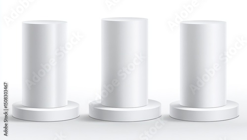 cylinder, display, racked, pedestal, dais, blank, white, product, promotional, empty, showcase, presentation, exhibition, advertising, graphic, design, template, mock-up, three-dimensional, modern, geometric, architecture, simple, minimal, clean, neutral, light, smooth, matte, round, footed, tall, vertical, set, three, identical, object, isolated, illustration, vector, realistic