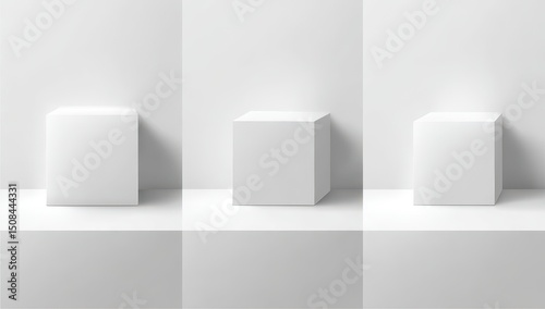 Three blank white cube displays on a light gray platform