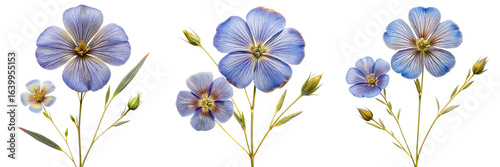 Three Blue Flax Flowers, Botanical Illustration, Isolated on Transparent Background, Linum usitatissimum, Flax, Botanical, Floral