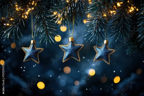 Three blue star ornaments hang on a Christmas tree branch. Perfect for holiday greeting cards, websites, or festive designs.