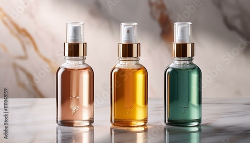 Three bottles of skincare serum in rose gold, amber, and teal.