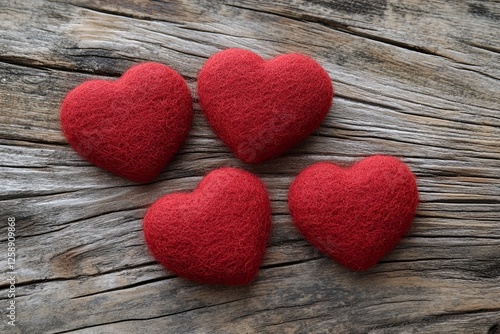 Three bright red decorative hearts are positioned on a rustic wooden table in the warmth of soft, natural light