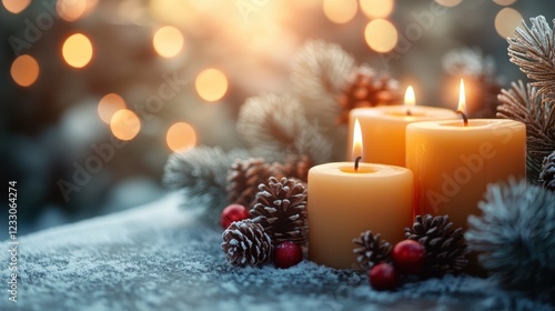 three burning candles with pine cones and red berries on a snowy table in a festive holiday setting, surrounded by warm glowing lights