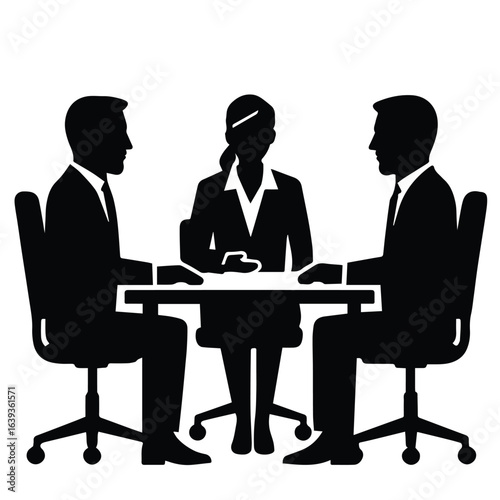 business, meeting, people, silhouette, team, collaboration, discussion, interview, job, office, workplace, professional, executive, colleague, teamwork, strategy, planning, conference, room, table, chair, formal, attire, suit, agreements, negotiation, partner, employee, management, corporate, company, career, success, presentation, communication, dialogue, group, gathering, white, background, isolated, vector, icon, graphic, illustration, minimalist, simple