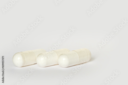 Three capsules close-up on a light background. Mock up for Medical, pharmacy and healthcare concept