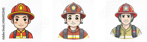 Three cartoon firefighters with different poses and expressions, all wearing fire helmets.
