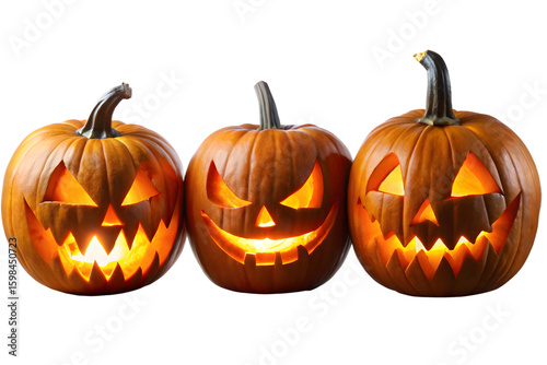 Three carved jack o lanterns with glowing faces are arranged together, isolated on a transparent background