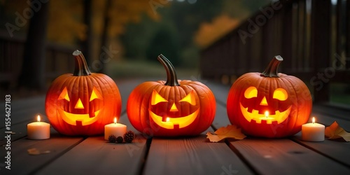 Three carved pumpkins with lit candles on a wooden deck, bathed in warm light,with three carved pumpkins arranged in a horizontal row. Background with halloween pumpkins, candles and autumn leaves