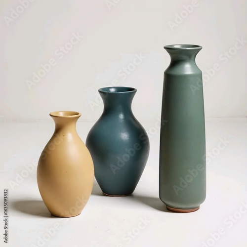 Three Ceramic Vases in Beige, Teal Green, and Green on White Surface