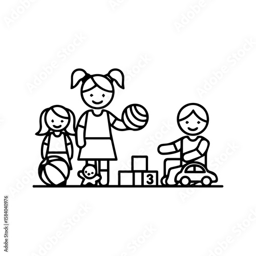 children, play, playing, toy, toy, block, block, ball, girl, boy, stick, figure, illustration, happy, fun, childhood, together, game, day care, car, school, activity, recreation, family, friends, learning, drawing, black, white, line, art, icon, symbol, simple, design, children, teddy, bear, group, education, kindergarten, preschool, linear, artwork, vector, graphic, outline, cartoon, friendship