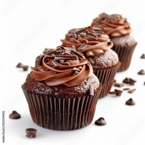 Three chocolate cupcakes with chocolate frosting and chocolate shavings are arranged in a row on a white background