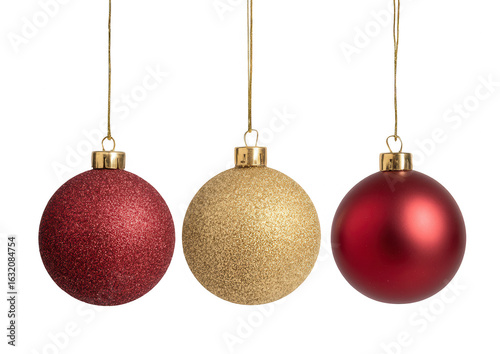christmas, ornament, ball, red, gold, hanging, string, festive, decor, holiday, sphere, glistering, shiny, sparkly, ball, decoration, metal, sparkle, decoration, three, group, isolated, black, background, simple, circular, round