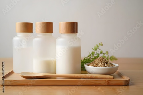 Three clear bottles with wooden caps and a small bowl of seeds on a wooden tray