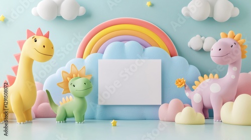 dinosaur, cartoon, rainbow, cloud, presentation, whimsical, colourful, children, children, cute, friendly, playful, prehistoric, fantasy, imagination, illustration, background, design, template, banner, poster, advertisement, marketing, promotion, copy space, message, announcement, invitation, greeting card, birthday, party, celebration, childcare center, pastel, blue, pink, yellow, green, orange, sky, fun, happy, cheerful, joy, love, adorable