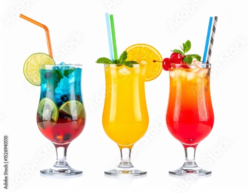 cocktail, drink, colourful, summer, tropical, beverage, blue, yellow, red, orange, refreshing, ice, mint, fruit, lime, cherry, straw, glassware, epicure, party, celebration, vacation, bar, eatery, delicious, tasty, sweet, mixed, alcohol, holiday, photo, food, studio, shot, white, background, isolated, vibrant, colours, cocktail, drink
